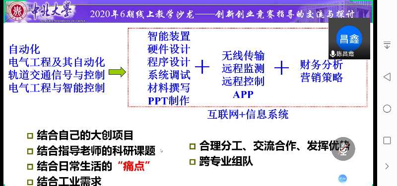 尤文斌老师主要结合“互联网+”大学生创新创业大赛,讲解了指导学生组队、选题、撰写计划书、制作视频和PPT方面应该注意的问题,与参会老师分享了指导经验。陈昌鑫老师围绕新工科与创新创业,“创意-创新-创业”创新链构建与参会老师进行了交流,并以指导“互联网+”大学生创新创业大赛为例与参会老师进行了探讨。