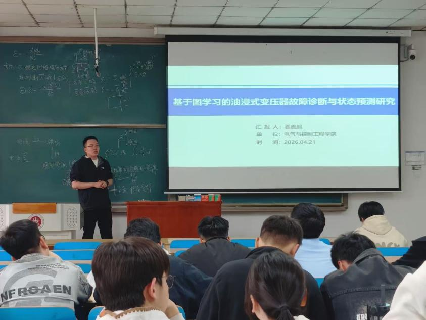青年教师翟鑫鹏博士担任主讲嘉宾,为同学们带来《基于图学习的油浸式变压器故障诊断与状态预测研究》专题讲座,围绕深度学习在电气设备智能检测与状态评估中的前沿应用展开深入讲解。