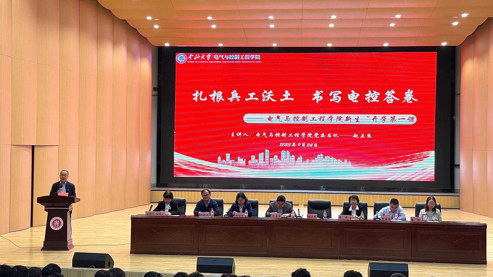 院党委书记赵正杰以《扎根兵工沃土 书写电控答卷》为2025级本硕博新生带来“第一课”:一要守规矩,锤炼严谨作风,擦亮“电控底色”;二要立大志,心怀“兵工情怀”,将个人理想融入国家需要;三要重实干,练就“创新本领”,在真学真练中成长成才。希望新生在中北兵工沃土扎根,成长为能“控制人生航向、驱动时代前行”的栋梁之才。