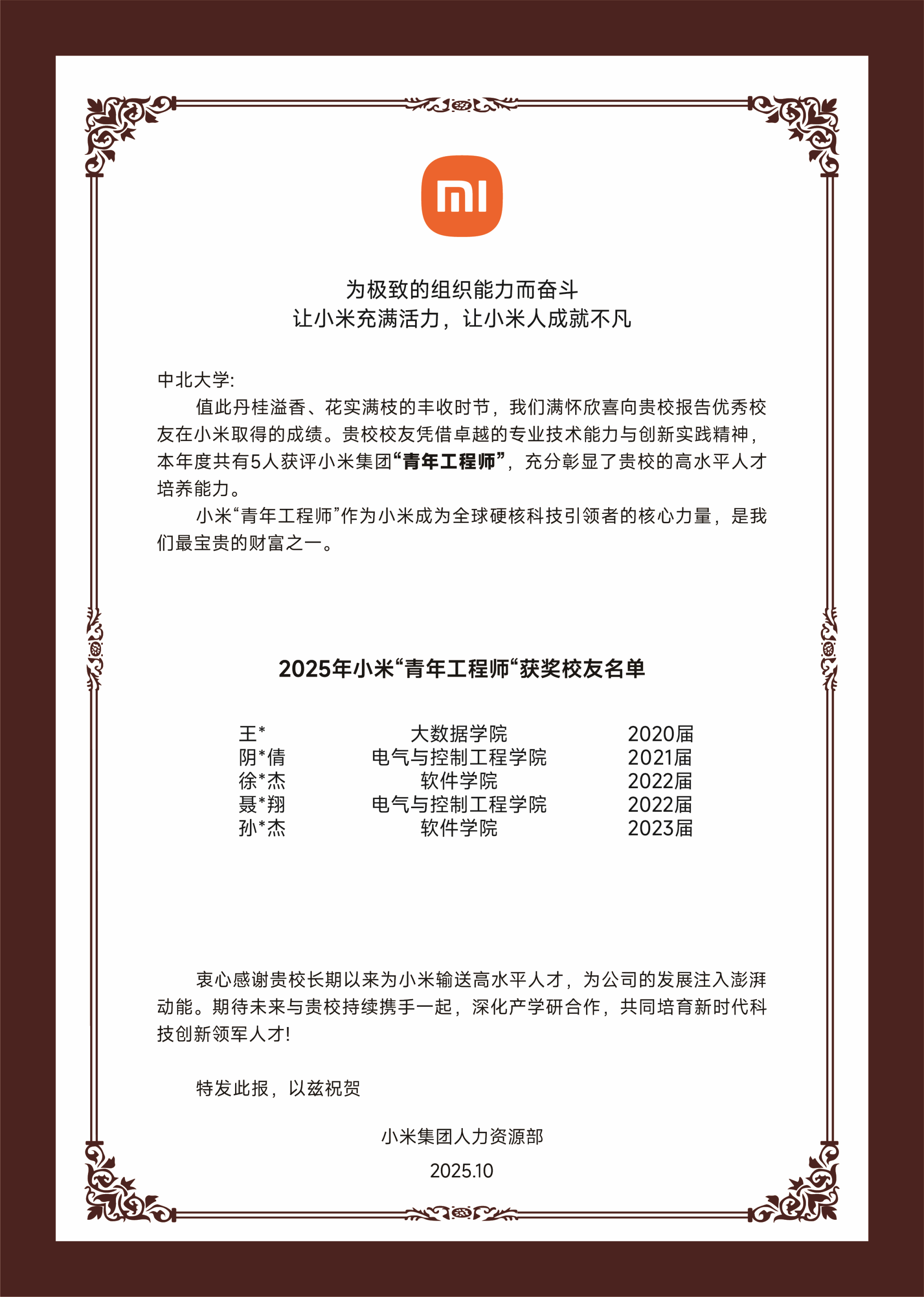 发来贺报,祝贺我校5名优秀校友在2025年度荣获小米“青年工程师”称号,其中性爱视频