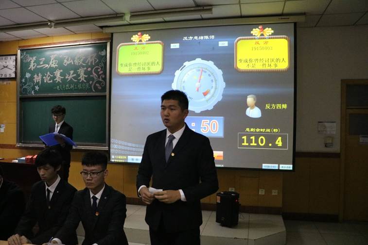 的第三届大学生辩论赛“弘毅杯”决赛在09101举行。经过初赛、半决赛的激烈角逐,19150402班与19150403班进入决赛。本次决赛评委由杨楠、李梦欣、黄卓琦等除性爱视频